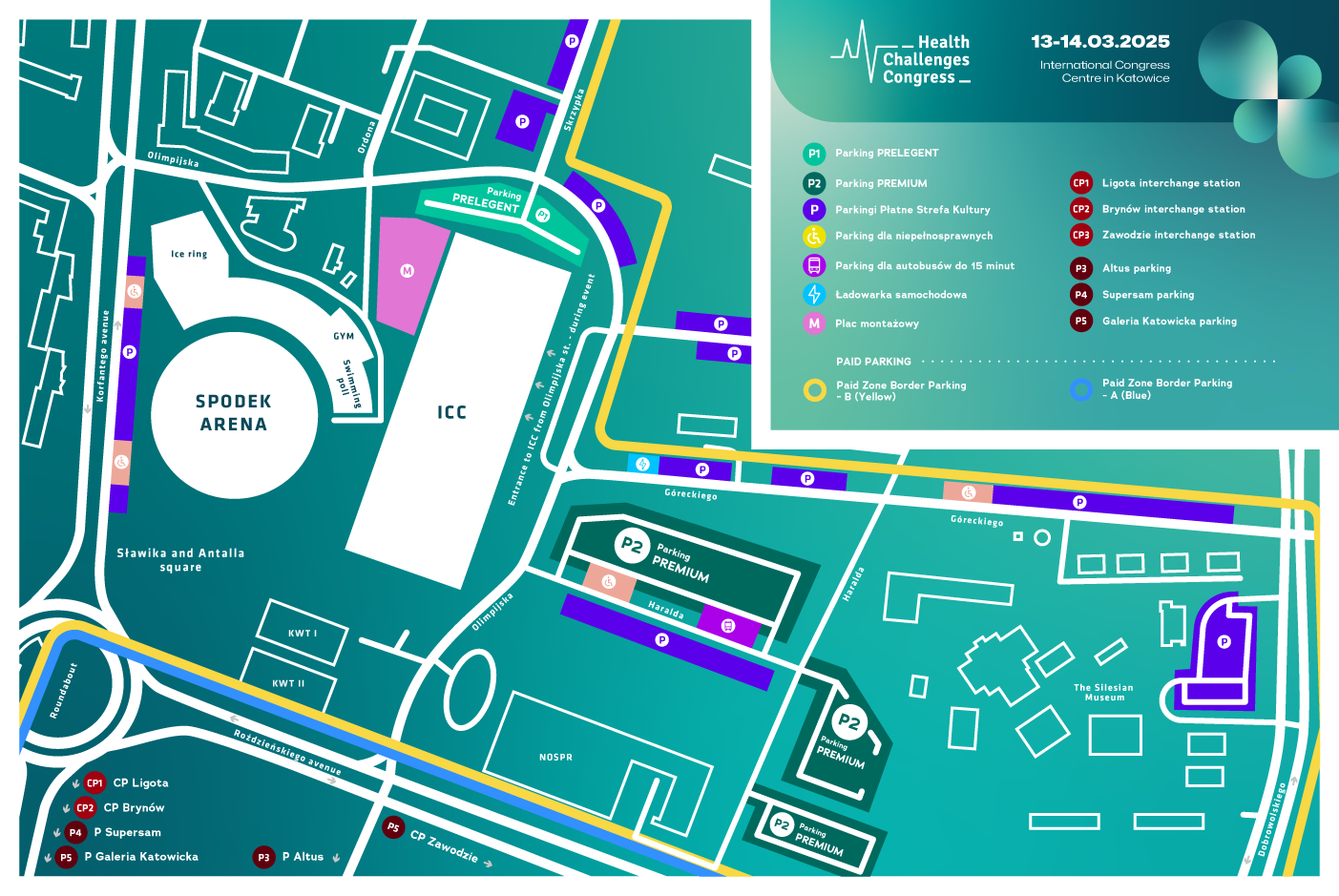 If the designated parking spaces are full, we encourage you to use public parking areas around the International Congress Center within the Katowice Culture Zone or beyond. Payment is at your own expense.